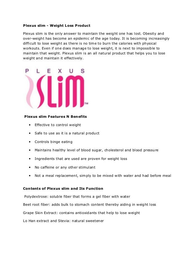 Plexus Product Ingredients Document Written by; Carolyn Waygood Certified Pilates Instructor and Independent Plexus Ambassador Plexus Slim promotes: Loss of weight and inches by burning fat, not muscle, Healthy blood sugar levels, ... Read Document